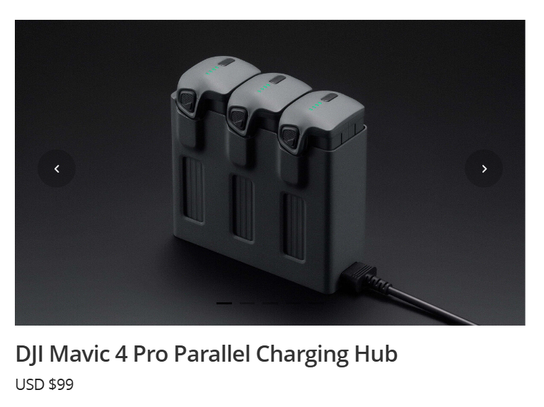 With the DJI Mavic 240W Power Adapter, the Mavic 4 Pro Parallel Charging Hub can fully charge one battery in 51 minutes and charge three batteries simultaneously via the Mini SDC interface. The hub prioritizes charging the lowest‑power battery to improve efficiency. When all three batteries reach the same level, it automatically switches to parallel charging mode and can fully charge all three in just 90 minutes.