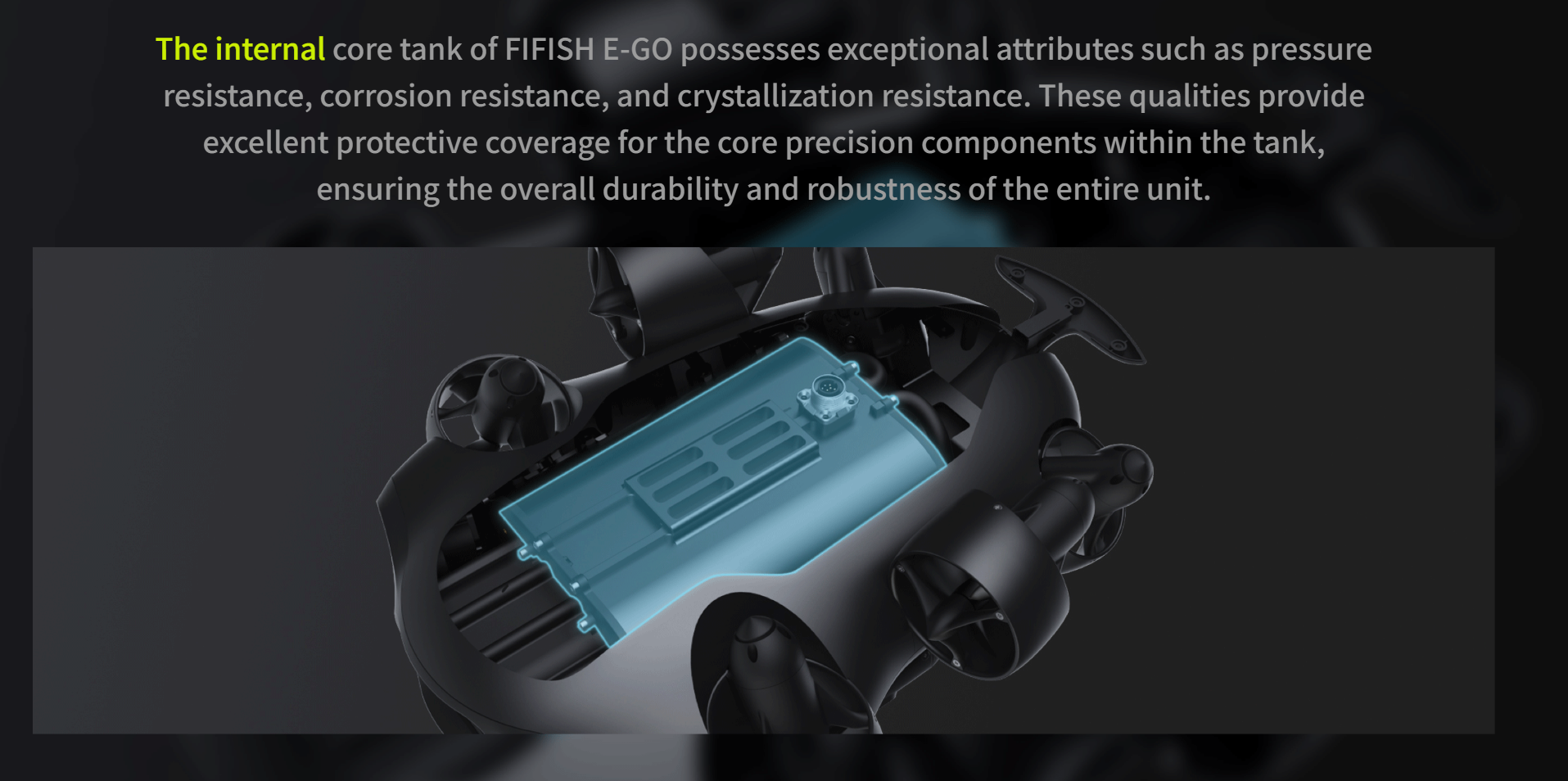 The internal pressure-resistant core tank of FIFISH E-GO delivers outstanding performance, including pressure resistance, corrosion resistance, and anti-crystallization properties. These features provide exceptional protection for the core precision components inside the tank, ensuring overall durability and long-term reliability.